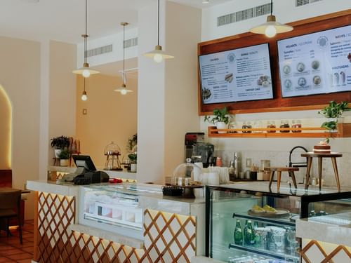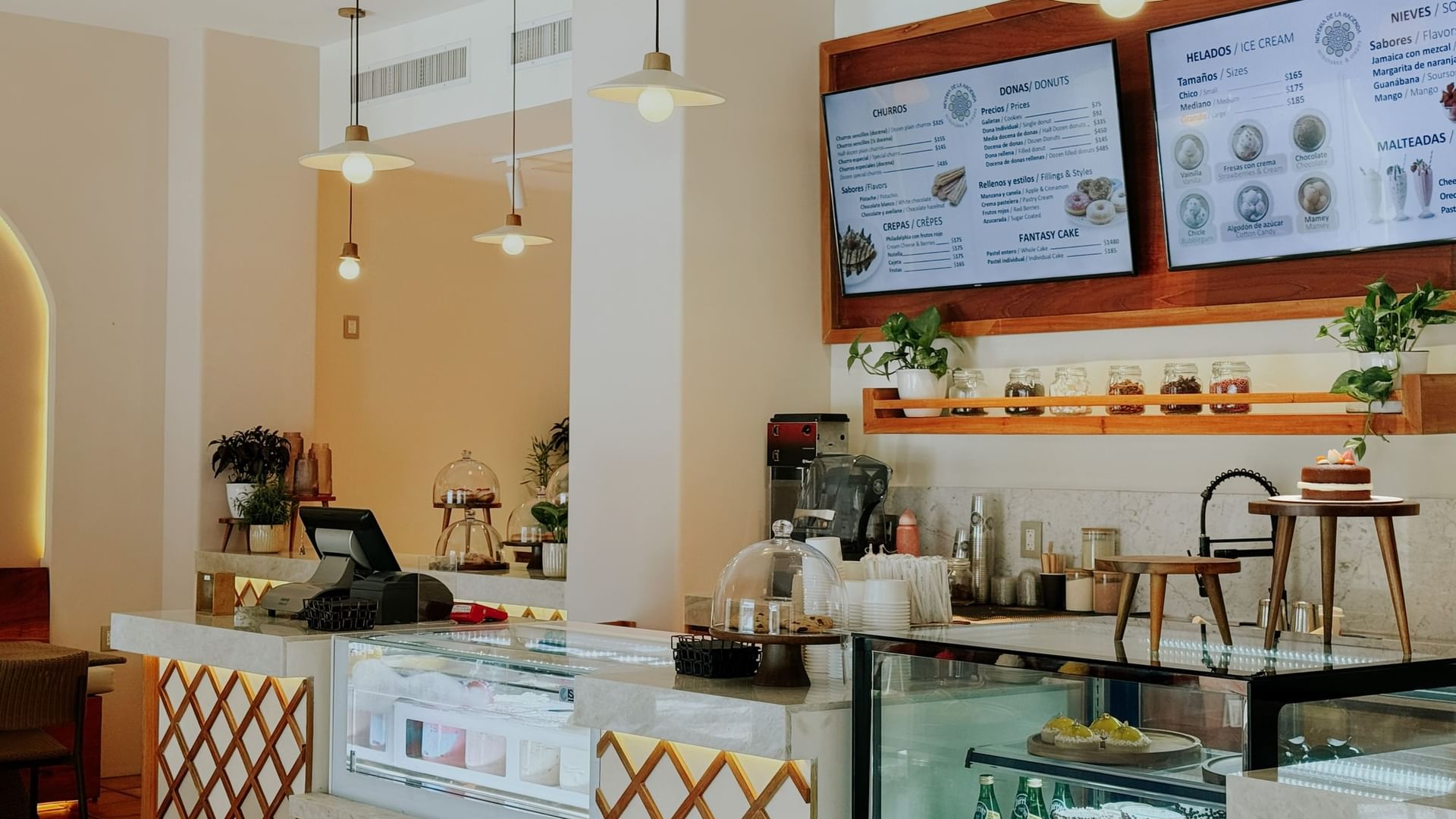 La Nevería de la Hacienda offers an exclusive experience within the hotel, blending traditional Mexican flavors with a modern, sophisticated twist. Enjoy a premium selection of artisanal ice creams, milkshakes, churros, crêpes, donuts, and cakes, all made with the finest ingredients.